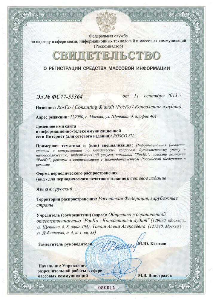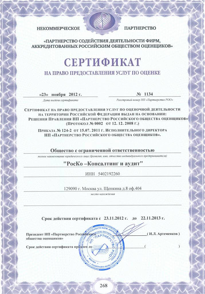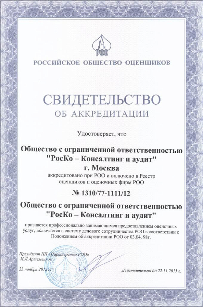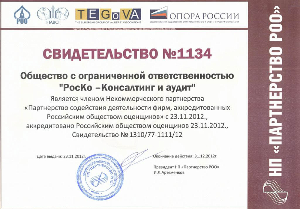 RosСo公司获得了评估鉴定服务授权证书,并可在俄罗斯联邦境内提供相关的服务。本授权证书由俄罗斯自律组织估价师伙伴团体理事会通过的决议签发给本公司(记录书第0002号,2008年12月12日)。